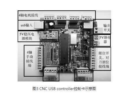 数控木工雕刻机的系统属于多主结构的数控系统,PC机和运动控制器两者之间资源实现共享,非实时性任务分别有PC机和运动控制器分别完成。CNC USB controller运动控制卡是介于电脑和电机驱动器之间的设备,使用电脑的USB端口,利用USB CNC软件平台,不需要任何附加软件。运动控制器是数控系统实现速度和位置的关键硬件,选用一个四轴的运动控制卡,控制卡的外观与控制模块如图3所示。
